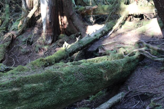 Walking past remnants of the whaling industry and into the forest behind the houses there was evidence of a partially carved out canoe, moss covered, blending into the forest surrounding it. Abandoned – familiar story – probably as smallpox forced people to leave. Photo as header above
