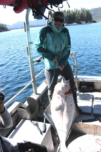 A spot of halibut fishing in the afternoon – jiggling would better describe it. James caught a small ugly fish on the handline, seconds later I pulled in my line to find the same ugly fish. Moved spots and Rosie took the rod while I went to the loo. Returned to find Rosie working hard to reel in what turned out to be a 51 inch Halibut likely weighing about 65lb.
