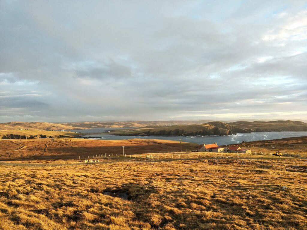 Stopping on the hillside overlooking Voe – looking down on the small town with vivid green hills surrounding the calm water of Olna Firth. Voe has a long history and even from the hilltop older buildings dotted throughout the town were visible.