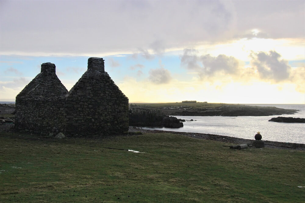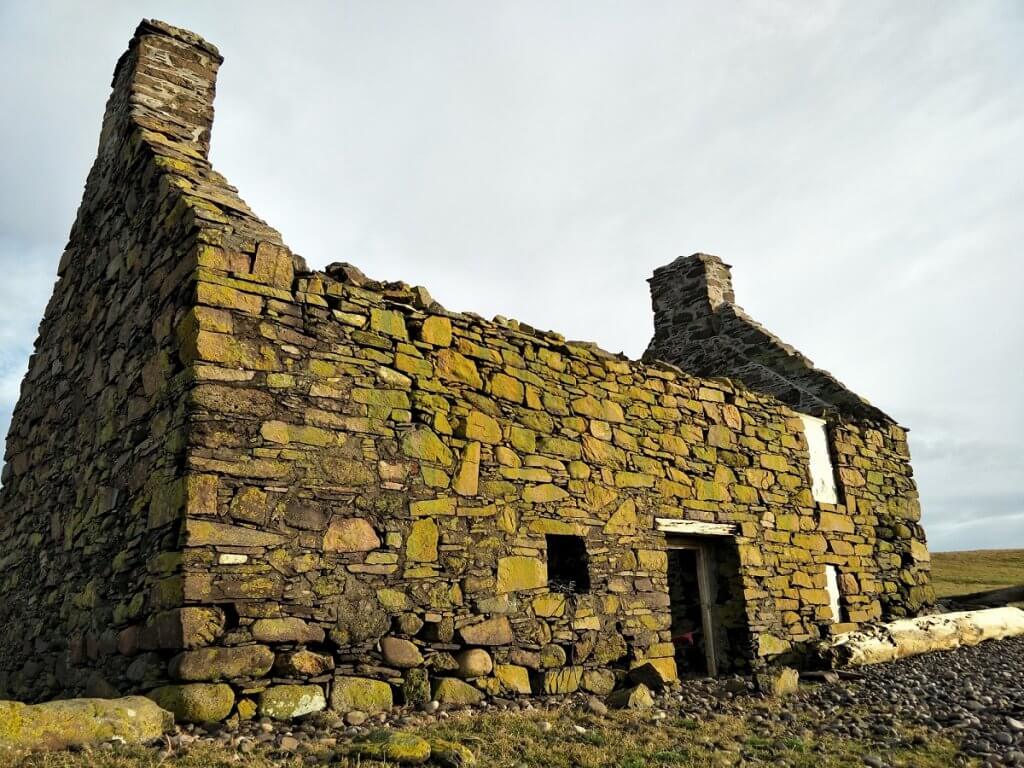 Further along – the remains of a Haaf fishermens’ village. The village had consisted of rows of long hangar-like stone huts with rooves of wood and turf, sometimes roofed with old boats! Now piles of stones remain to remind of the hard rugged life the fishermen lead.