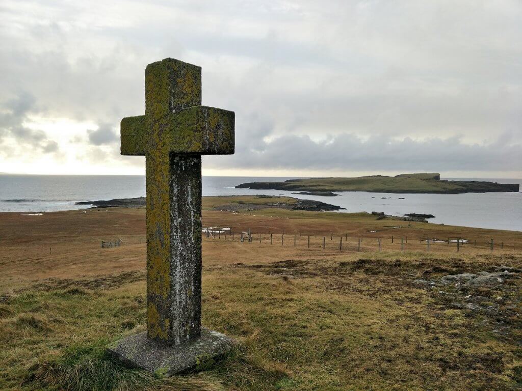At the top is a large stone cross erected in 1927 to mark the spot where supplies for the Eshaness Lighthouse were landed. The large cross is now pitted by the weather and glows from the green moss covering one side.