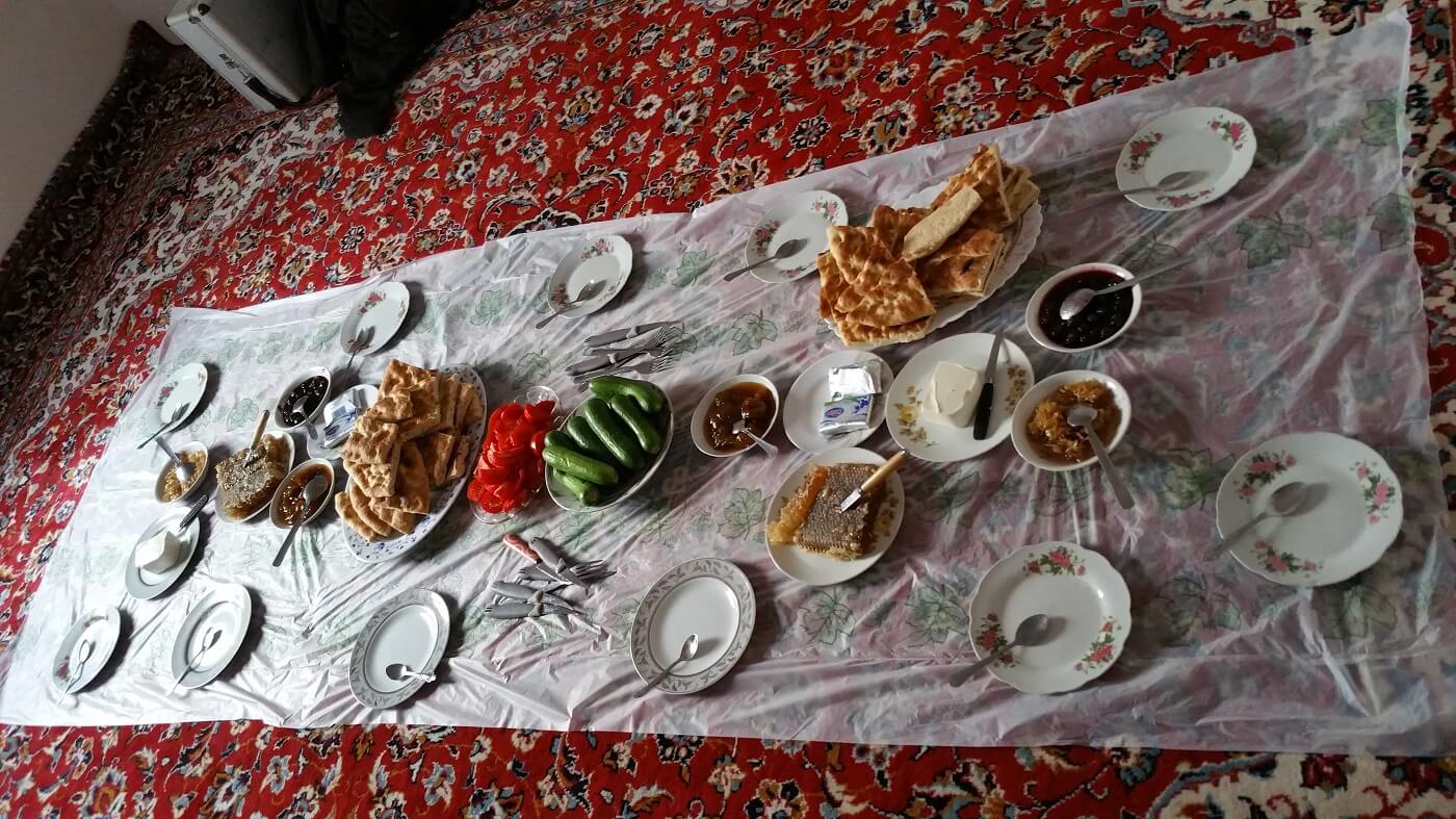 First to breakfast – another feast on the floor as we sit on the colourful Iranian carpet, around the tear-off plastic cloth that has replaced the traditional cloth. The tablecloth was laid out with thick warm flat bread, tulip glasses of Iranian tea, honeycomb honey, homemade jam, creamy cheese with fresh tomatoes, and cucumbers.