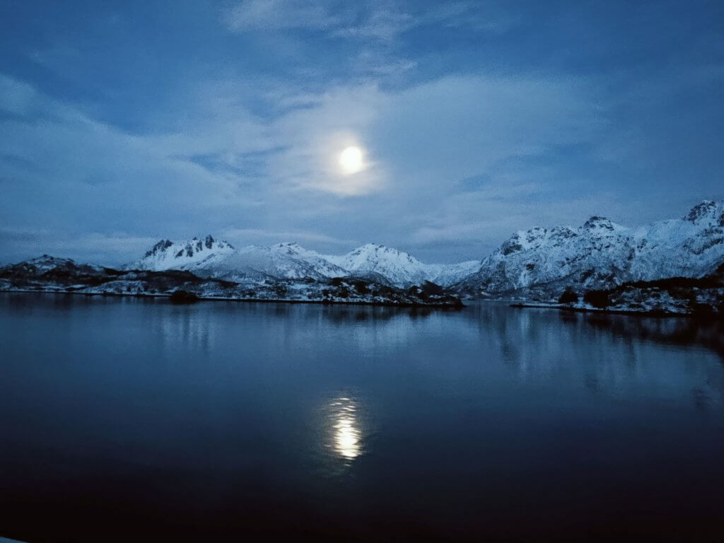 We sailed in calm waters towards Trollfjorden a narrow fjord passable only by smaller boats. Turning on a sixpence the ship swirled around to enable us to look up into the narrow fjord with sharp dark mountains rising all around us. Behind us, a full moon completed the idyllic moment.