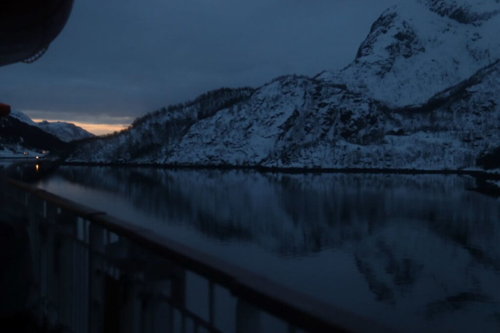 Once on the water again a rare treat was upon us. Trollfjorden and Raftsundet. The latter a narrow strait which we navigated at the magical Blue Hour. A spellbinding passage. The water was oily calm reflecting the mountains on either side, the distant sunset lit our way until all colour sank and only the blue remained.