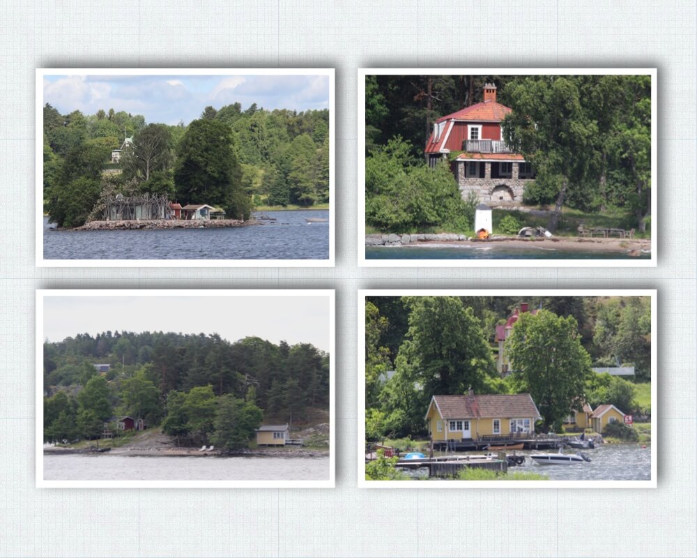Some are uninhabited but most have a variety of buildings ranging from apartments with their own marinas, large houses dominating a patch of green or tiny houses hiding in the forests that run down to the waters edge.