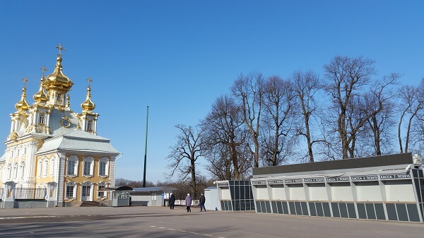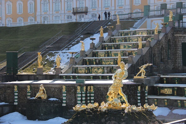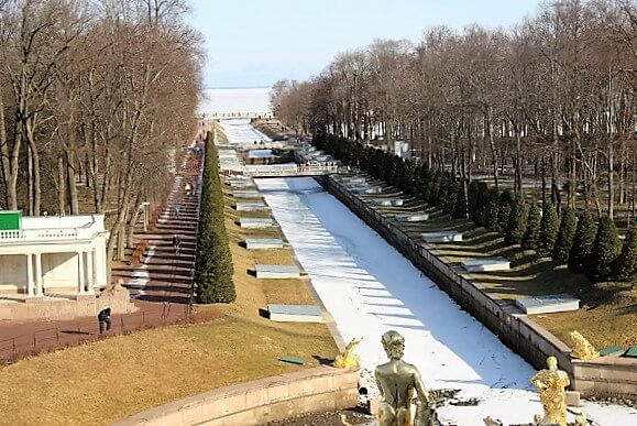 Peterhof is surrounded by huge garden and grounds that rival Versailles. And were modelled on Versaille – designed at the time to be even more magnificent. At the time of our visit the fountains were not working and statues were covered to protect them from the winter. Apparently Italian marble does not tolerate the icy temperatures and can crack.