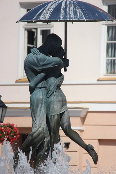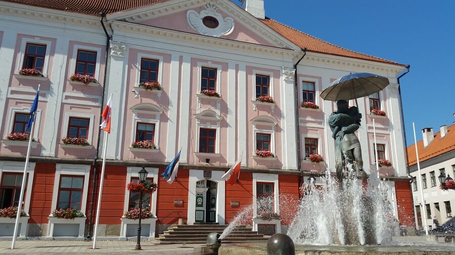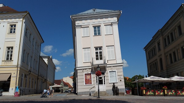 Wandering vaguely following the map lead us to the main square with Kissing Couple fountain and Leaning house of Tartu built in 1793 and said to have sunk when the building was built half supportedby the old city wall and the other side by poles.