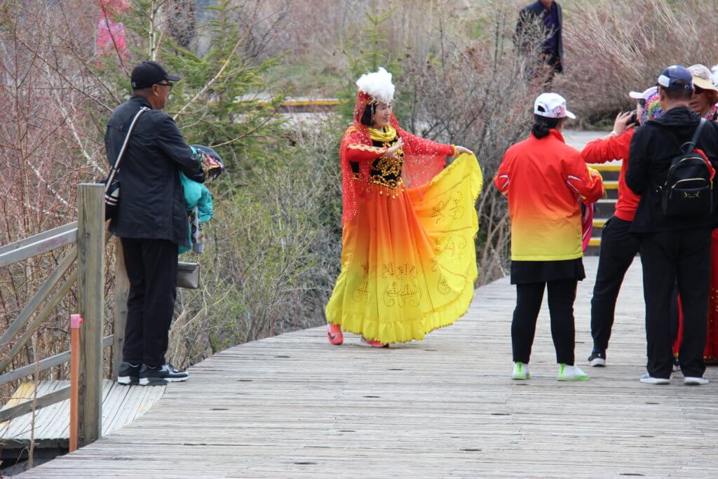 This is yet another example of Chinese tourism management which has adapted to effectively manage large numbers of people in potentially threatened environments.Even thought this is not peak season the numbers of people moving are staggering to Australians. And it highlights one of the paradoxes of China that whilst there are hordes of people that attend such attractions you can still escape them.In this case we walked to the lake rather than catch transport and then went for a walk.There were very few people on the trail but at the end we stumbled on a collection of bridal couples who had got to a scenic spot by road.