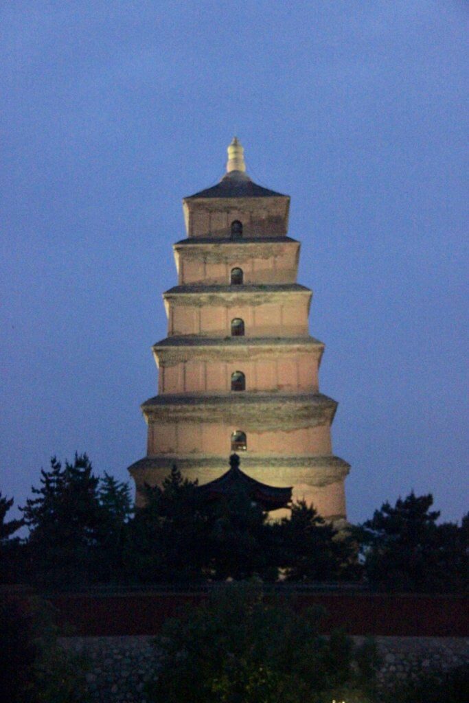 We then had a walk to the South Gate along the city moat amidst beautifully sculptured gardens. We then bravely took the metro with another million of our nearest and dearest and headed back to Big Wild Goose Pagoda to see the night lights. Arriving there in daylight we found crowds gathered around the lake in the pagoda square watching the dancing fountains. On to dinner after some sunset snaps of the pagoda.