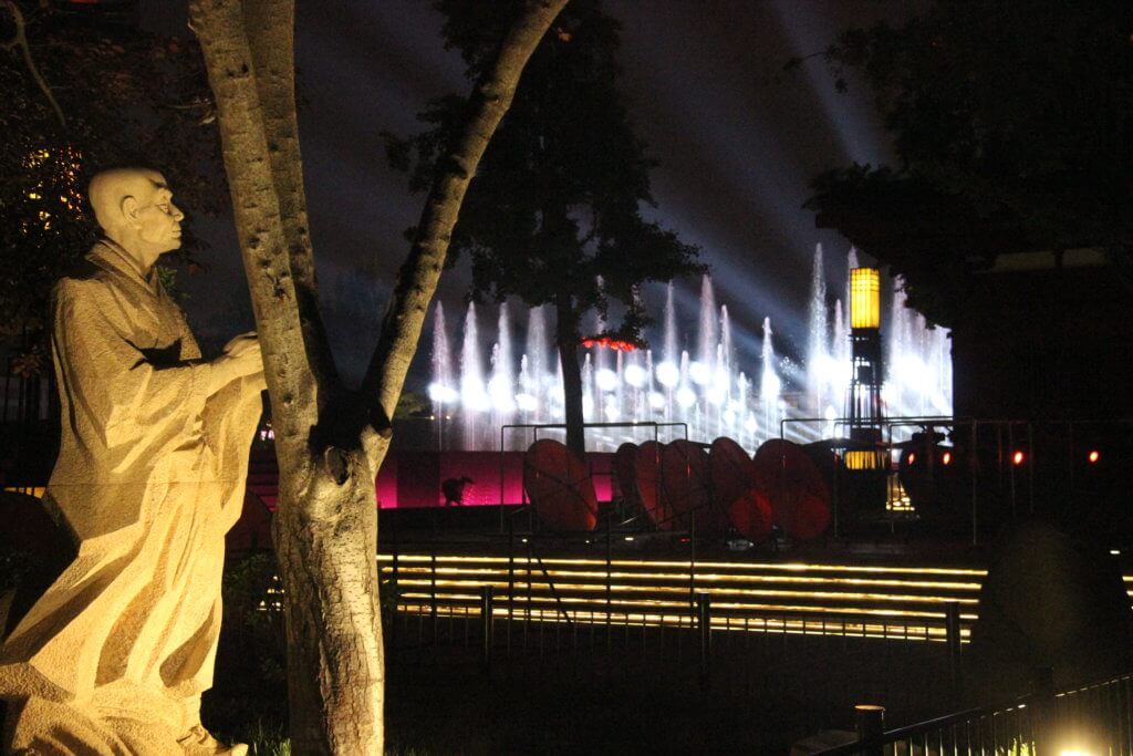 We found a Sichuan style restaurant where after much pointing at menus and the use of google translate we had a tasty dinner. Heading back to the metro after sunset the dancing fountains now featured coloured floodlights and the surrounding buildings were an extravaganza of neon.