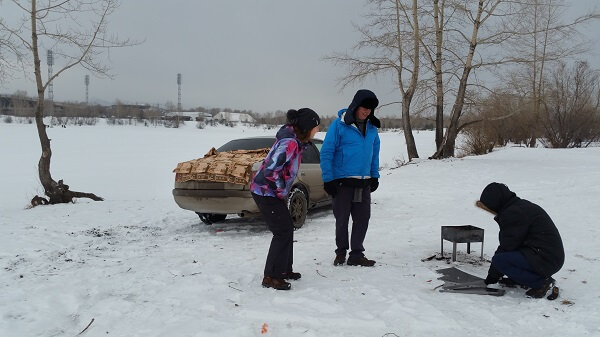 We had been promised shashlik but we were a little unsure where we would eat it. After being driven to an island in the middle of the Yenisei River which divides the city-we found out that the barbecue would be held in the snow with a temporary steel barby which housed a small cooking fire. The condiments and bread were stacked on the boot of the car and we stood around eating and laughing. Pasha can’t speak English but his sense of humour and Katya’s translation created a laughter filled afternoon.