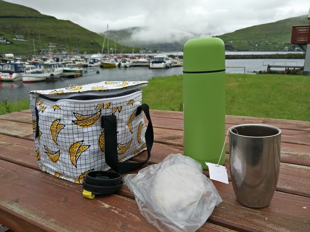 Spotted a lovely picnic spot and sat near a boat harbour enjoying my picnic lunch. Recalling our checklist in Iceland – not windy, not raining, nice outlook, a tree. The latter never happened, the rain and wind were present more often than not, and the view sometimes Yes sometimes No. One memorable No was a French group who chose to pull in with campervans and park right in front of our table blocking all view. Today I had a lovely view, a tree a way behind, and there was rain and wind.