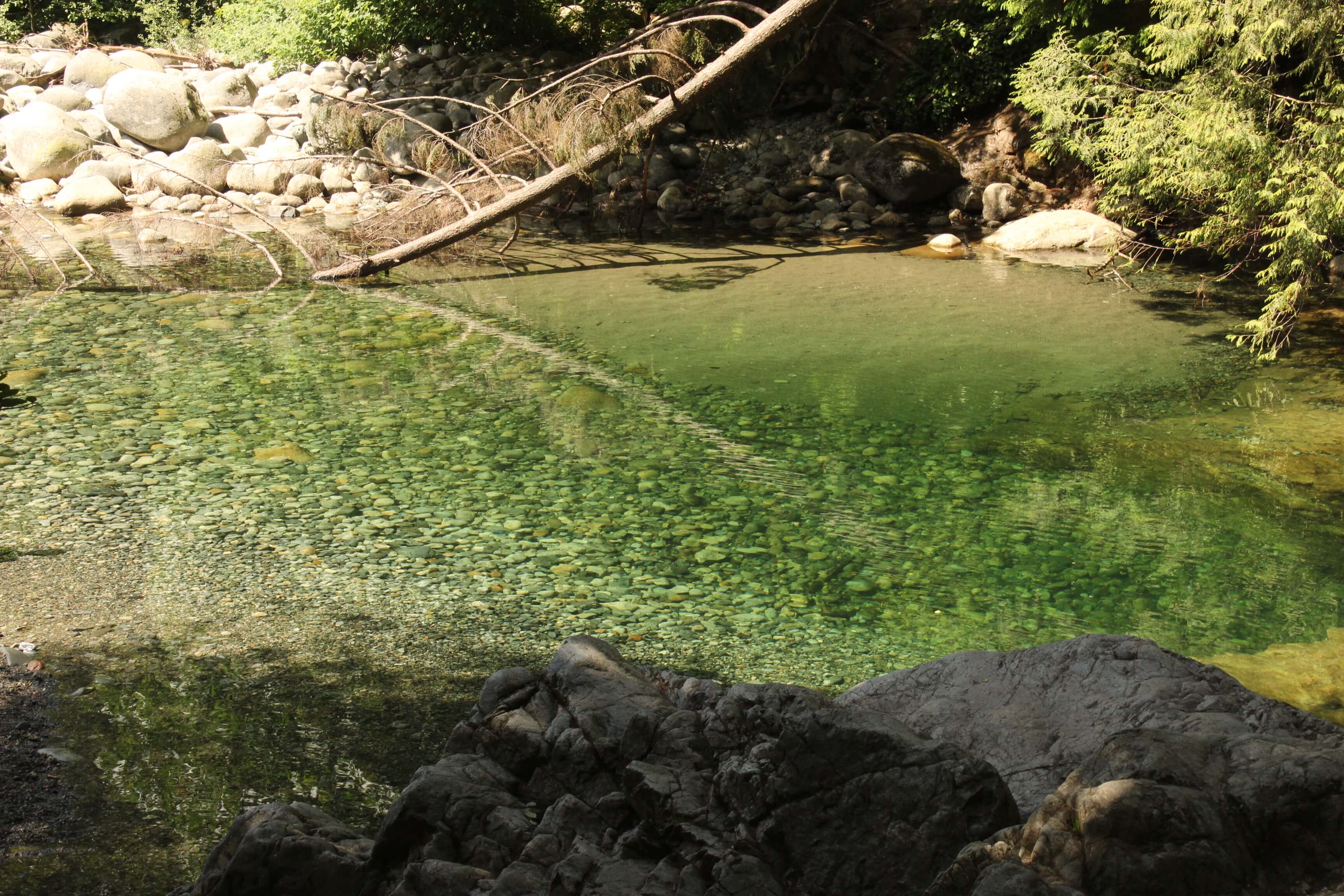 The forest walk was moss and fern filled down to a clear green pool surrounded by large rocks.