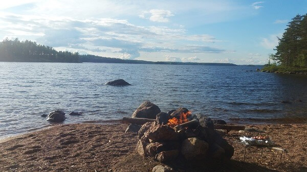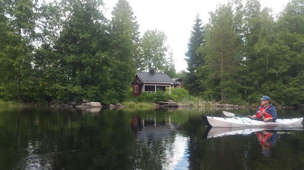 A perfect day on the water – blue sky, calm waters, forest dotted with hidden cabins, homes on the waterfront with older homes having the traditional sauna right on the waterfront.