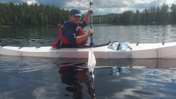 Finally we prepared to go on the water. Seeing only one double kayak I asked Sami where his kayak was – out he came with a suitcase sized package – and out popped an Oru Kayak – the setting up of which fascinated an older gentleman walking by who stopped and watched the whole set up. And Chris – who had seen it as a Kickstarter project – and hankered after one since then.