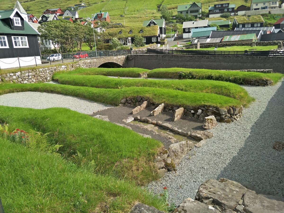 On the foreshore were the buried remains of Viking settlement with long houses visible under the turf. Viking ruins in Faroe Islands