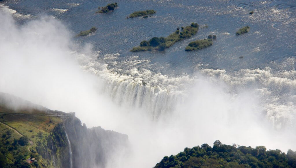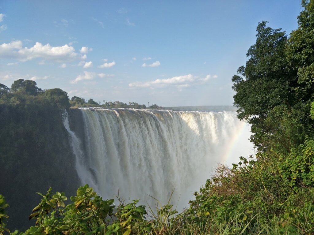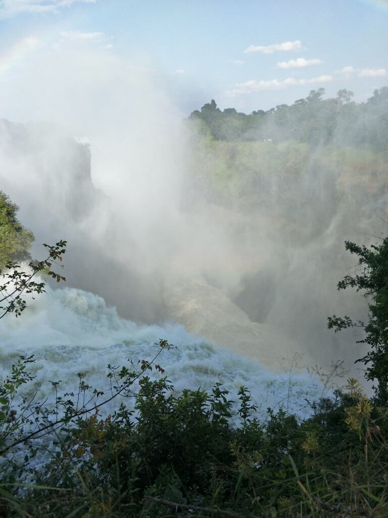 Water was visible though not instantly recognisable as we arrived in Victoria Falls. What looked like a line of white smoke over the bushes was in fact spray from the thundering falls hitting the floor and spraying up into the sky.