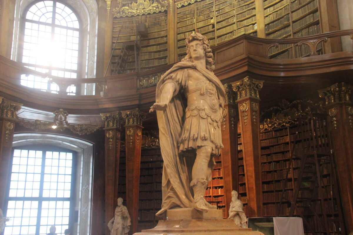 The historic library in the State Hall a lush and heavily Baroque building built in 1700s. Complete with frescoes across the ceilings and extensive decoration in wood, gold, marble. Ancient large globes stand in the centre along with marble statues. Books are housed in beautiful polished wooden bookshelves and glass cabinets.